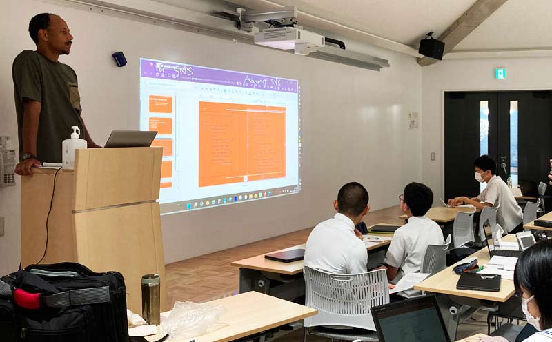 本日の√H特別講座では、まずソーシャルメディアの問題点についてみんなで考え、そのあとに2つのチームに分かれ、ソーシャルメディアが社会に与えるの影響はいいことが多いか、悪いことが多いかでディベートの準備をしました。そこで私たちは、デイビッド先生にディベートの型を教えていただきました。