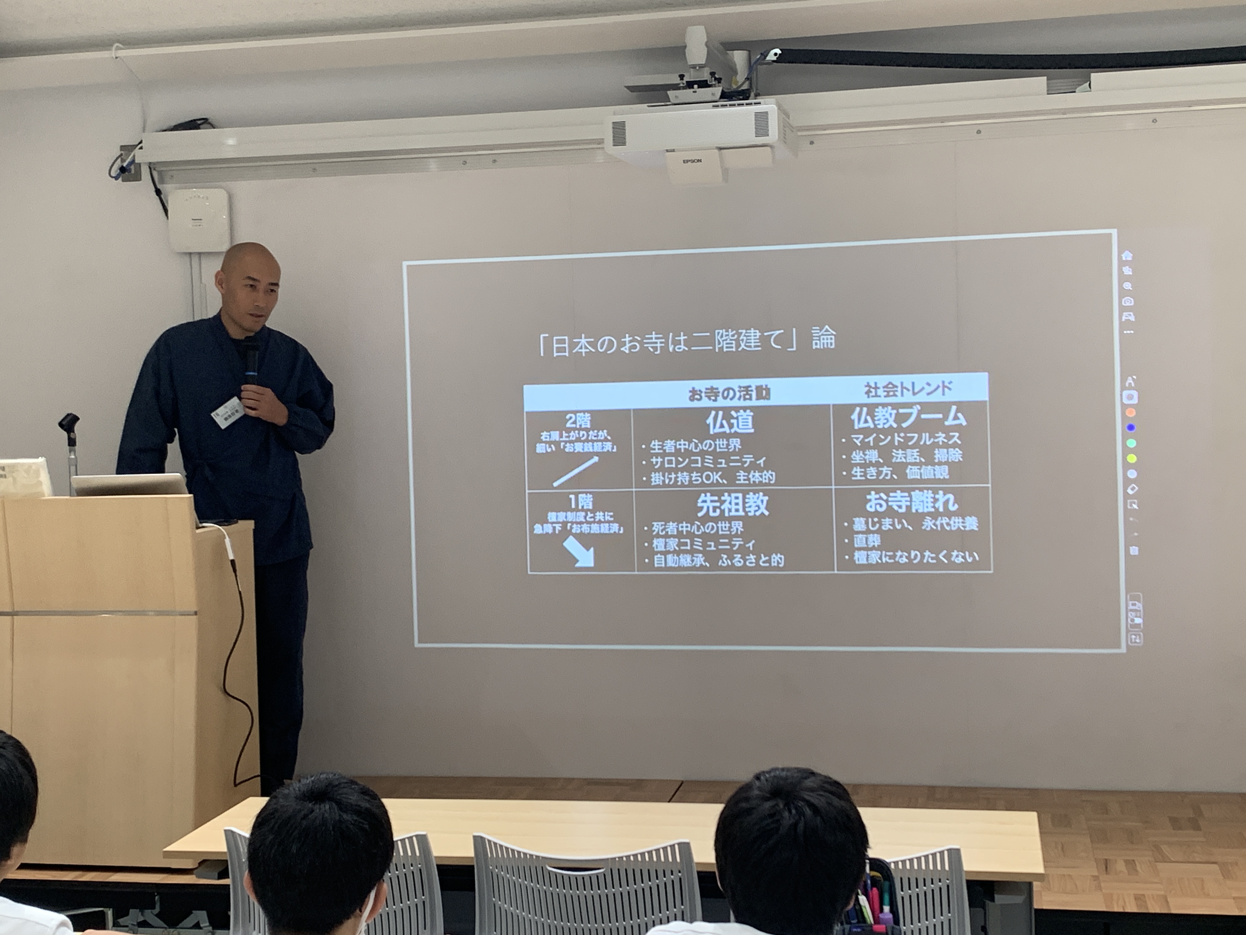 今回の海P講座では、産業僧の松本紹圭先生にお越しいただき、松本先生が翻訳された、「The Good Ancestor」という本をテーマにご講話をいただきました。松本先生は光明寺の僧侶、株式会社InterbeingのCEO、未来の住職塾の塾長、テクノロジーの祭典であるダボス会議への出席といった様々な活動をされている他、著書に「お坊さんが教えるこころが整う掃除の本」があります。松本先生は豊富な経験を共有して、「良き祖先」という意味の「The Good Ancestor」にいかにしてなれるか、自分がどう生きるかといった問いを中心に、話を展開していかれました。その中でも、未来世代に地球を残すために楽しみながら良い選択をすること、できるだけ多くの選択肢を残すことが大切であるということが印象に残りました。