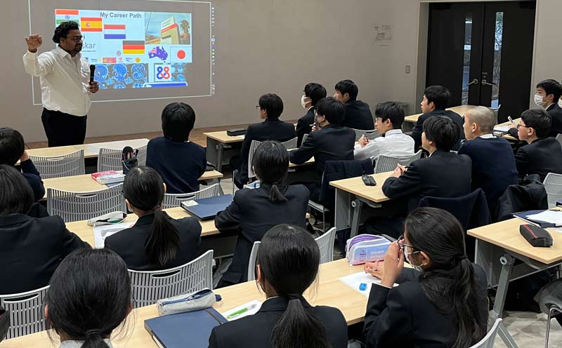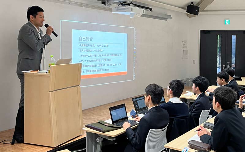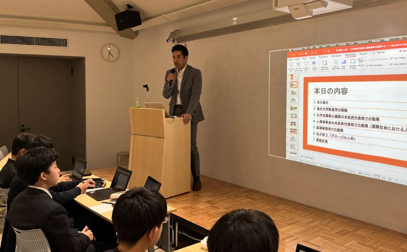 バッティーさんは、パキスタンと日本のハーフの方で、幼少期より国際紛争などのことに興味があったそうです。その後、西大和学園高等学校に編入し、大阪大学、東京大学大学院、ロンドン・スクール・オブ・エコノミクスにて学び、OPCW(化学兵器禁止条約)の日本外交団としてハーグの在オランダ大使館で勤務、これがバッティーさんにとって初めて国際社会で働くというご経験でした。その後、UNHRC(人権理事会)の日本外交団として、ジュネーブ国際機関日本政府代表部を経て、現在、国際連合事務総長室で勤務されてます。講義では、バッティーさんの国連での経験を基に主に外交官として働くこととグローバル人材について教えてくださいました。