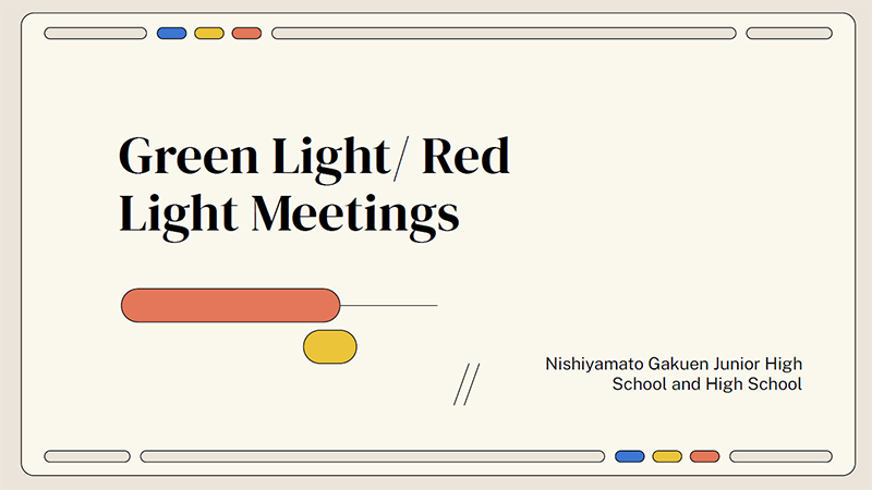 Green Light Red Light meetings は Green Light と Red Light の2つのコーナーに分けて行うディスカッションのことです。今回のテーマは「学校の宿題が多すぎる」というのに対して解決策を考えました。